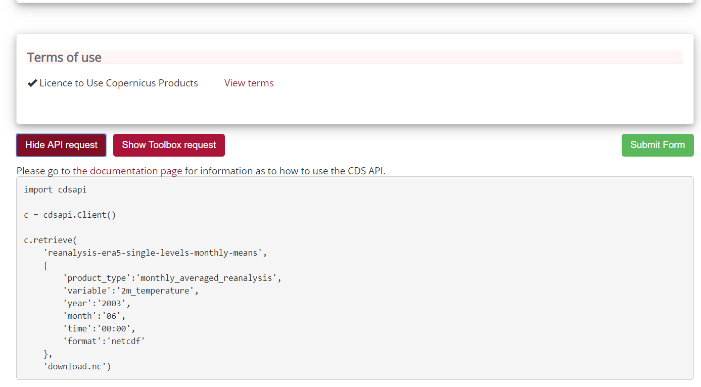 Once the CDS API client is installed, it can be used to request data from the datasets listed in the CDS catalogue. It is necessary to agree to the Terms of Use of every datasets that you intend to download.