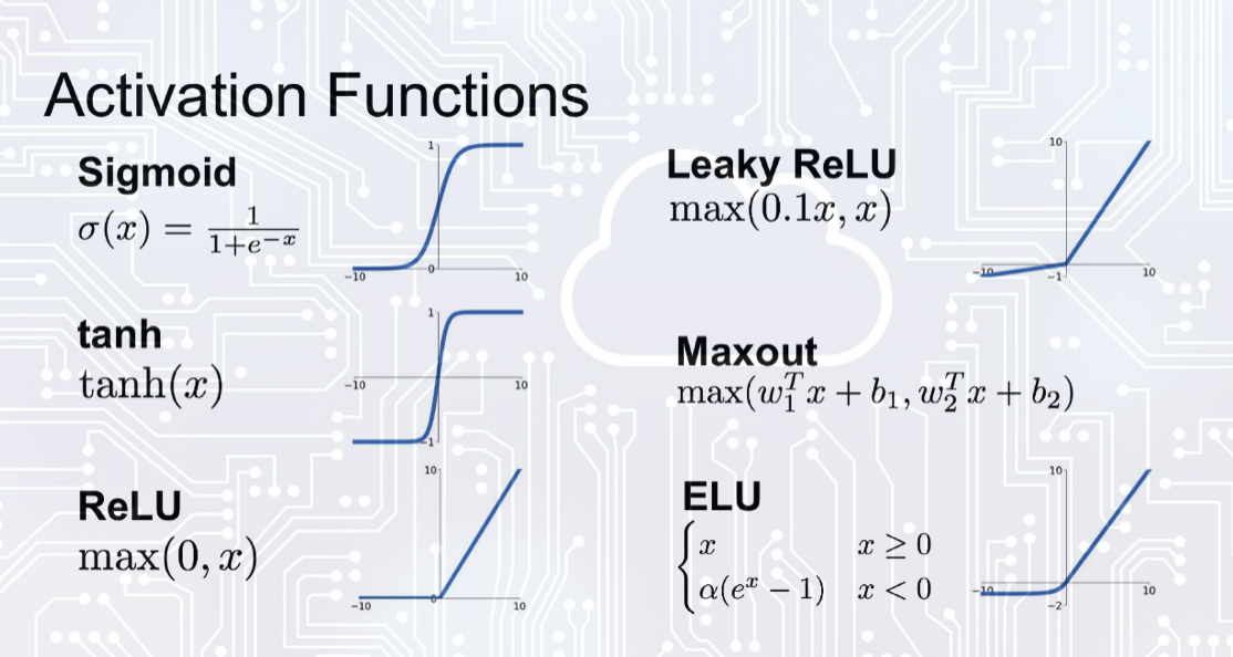 Activation function determines, if information is moving forward from that specific node. This is the step that allows for nonlinearity in these algorithms, without activation all we would be doing is linear algebra. Some of the common activation functions are indicated in figure below: