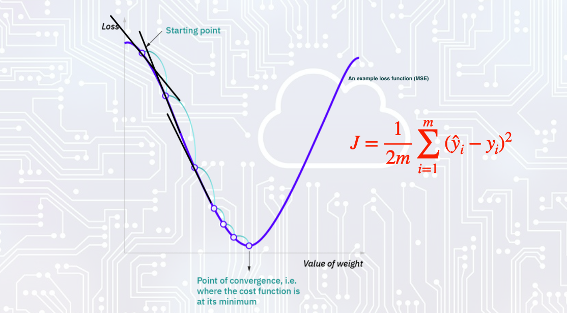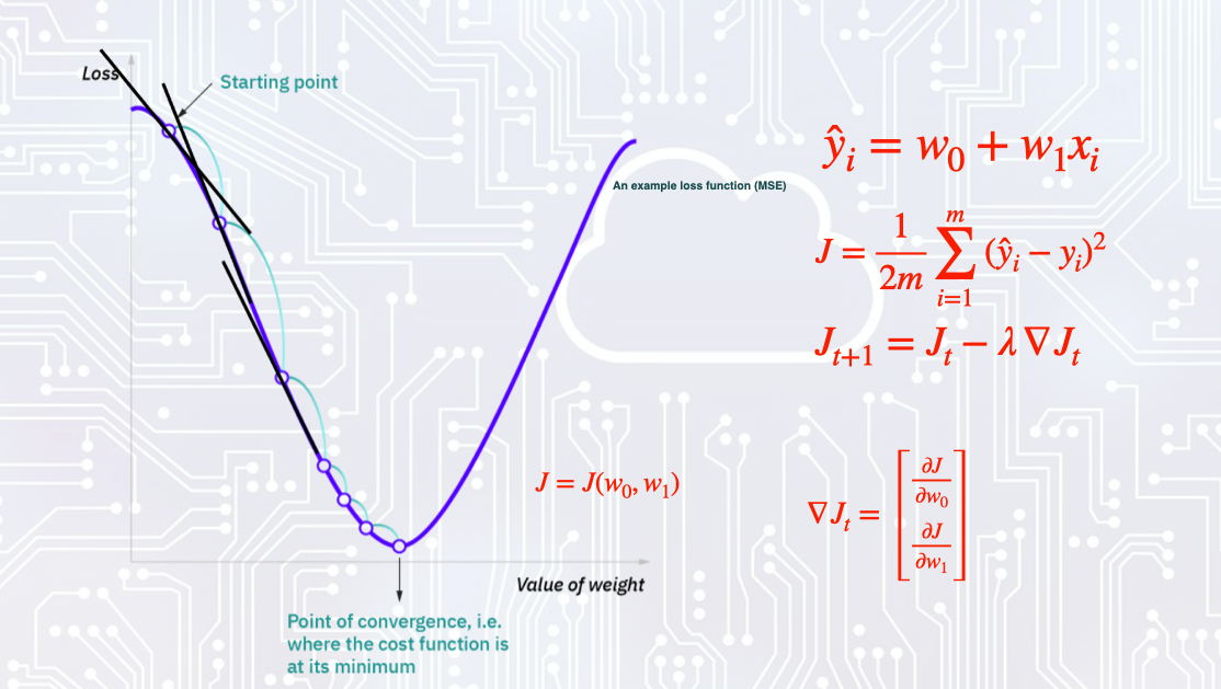 \[ w_{i+1} = w_i - \lambda \frac{\partial J}{\partial w_i} \]